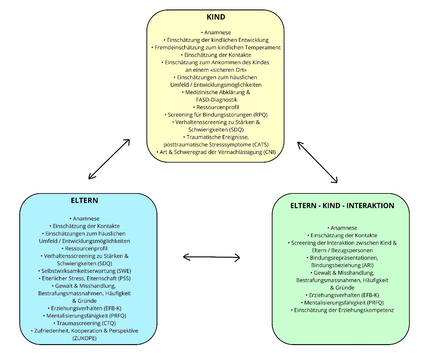 Im Zentrum des diagnostischen Verfahrens steht der multiperspektivische Ansatz: Kind, Eltern und Eltern-Kind-Interaktion beeinflussen sich gegenseitig und können folglich nicht isoliert betrachtet werden, um diagnostische Einschätzungen und Empfehlungen zu erheben. Vielmehr ist es wichtig, diese drei Ebenen durch gezielte Fragebögen im Selbst- und Fremdurteil (Fachpersonen und Eltern) zu analysieren, zu vergleichen und die Ergebnisse für eine passende Hilfeplanung miteinander in Verbindung zu setzen sowie Bedarf zu erkennen.